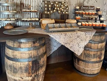 Authentic Jack Daniels Whiskey Barrels without a table top. We have 2 available that can be used separately or together with our table top to make the perfect dessert table! Table top rented separately